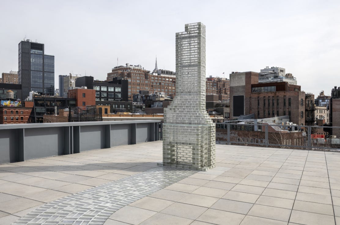 1) On the balcony of the Whitney Museum, the current biennial features a partnership with Hyundai Motor Company. It is a site-specific work of Kelly Akashi exhibited on the fifth floor of the museum, Monument (Altadena), 2026 — a chimney that functions as reconstruction and memorial. Akashi lost her studio in the Eaton fires in January last year, and the chimney was the only thing left. The sculpture serves as a meditation on survival, rupture and the fragile permanence of what remains.
